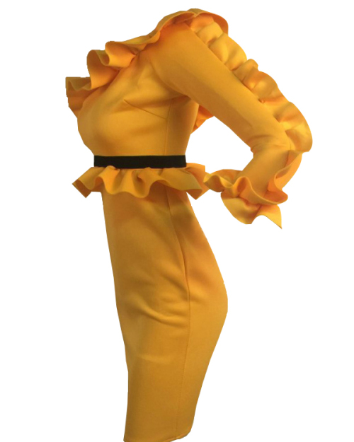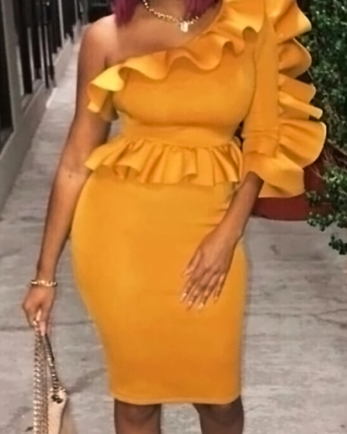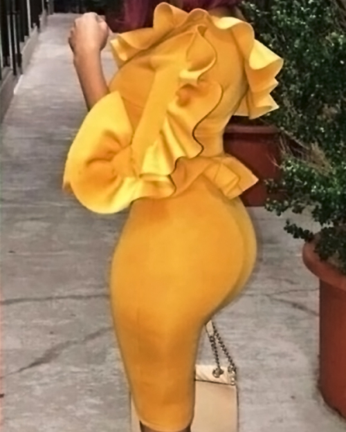 Sexy Skew Collar Stereo Lace Yellow Cotton Blend Knee Length Dress