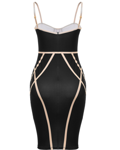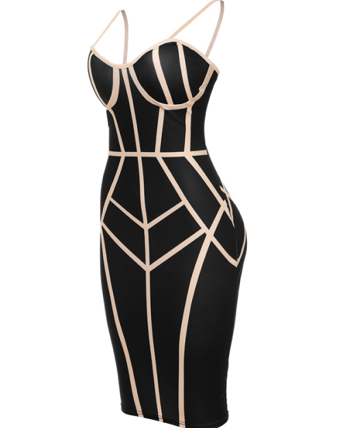 Sexy Spaghetti Strap Sleeveless Striped Printed Black Polyester Sheath Knee Length Dress