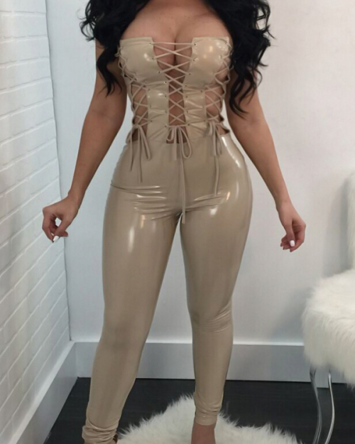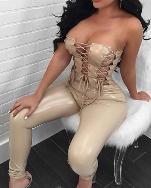 Sexy Strapless Lace-up Hollow-out Apricot Leather One-piece Jumpsuits