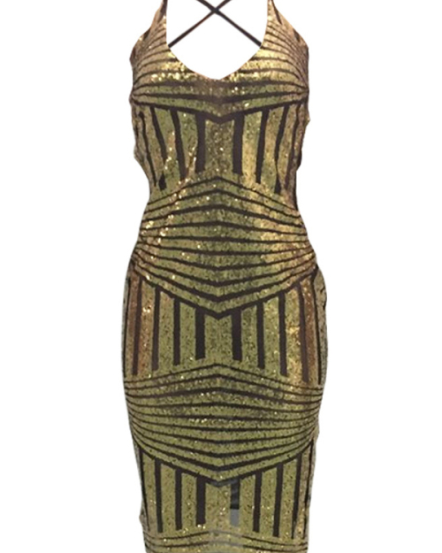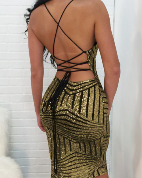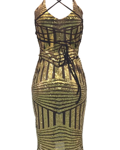 Sexy V Neck Back Lace-up Hollow-out Gold Polyester Knee Length Dress