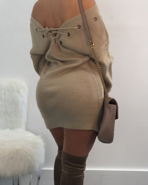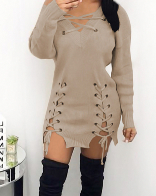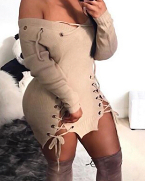 Sexy V Neck Eyelets Design Lace-up Khaki Polyester Mini Dress