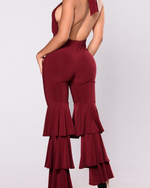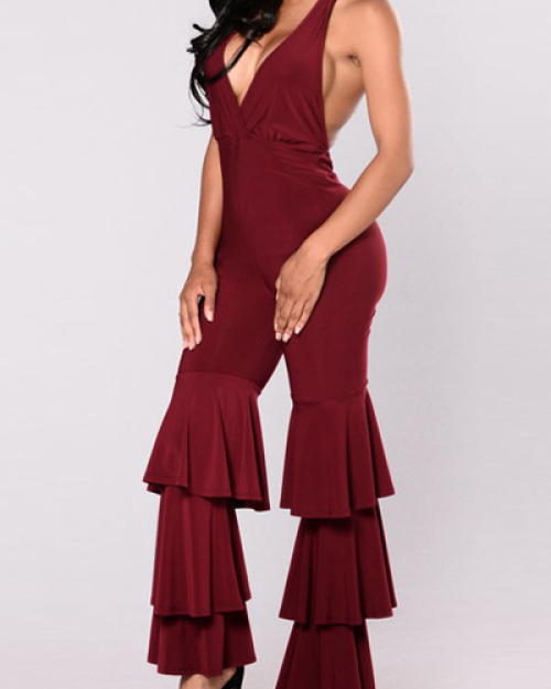 Sexy V Neck Falbala Design Red Milk Fiber One-piece Jumpsuits(Without Choker)