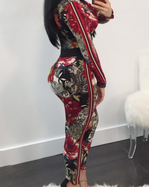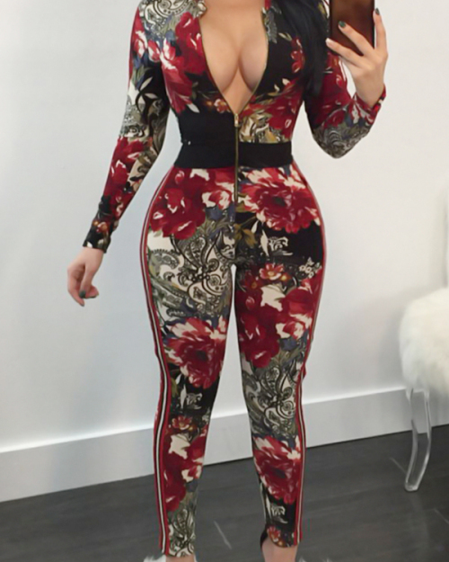 Sexy V Neck Floral Printed Red Polyester One-piece Jumpsuits