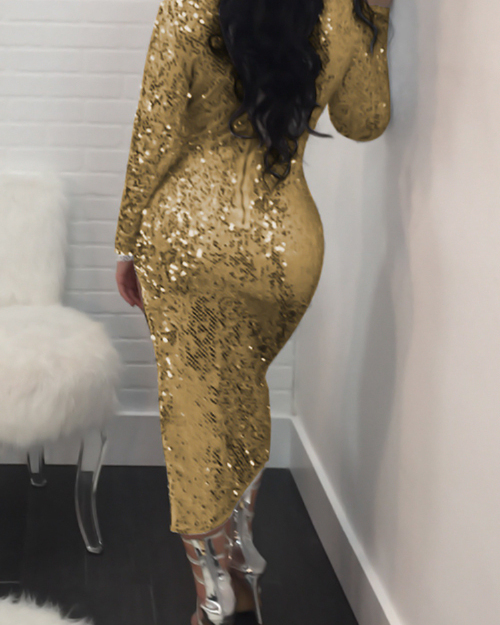 Sexy V Neck Irregular Hems Gold Polyester Mid Calf Dress