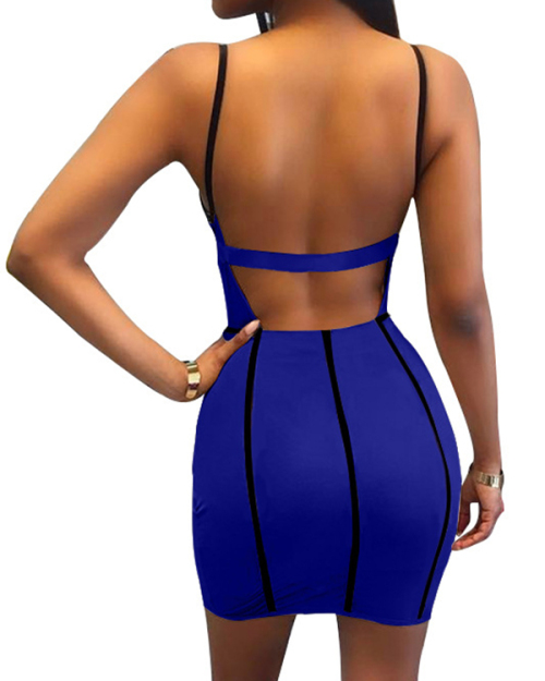 Sexy V Neck Striped Hollow-out Royalblue Milk Fiber Sheath Mini Dress