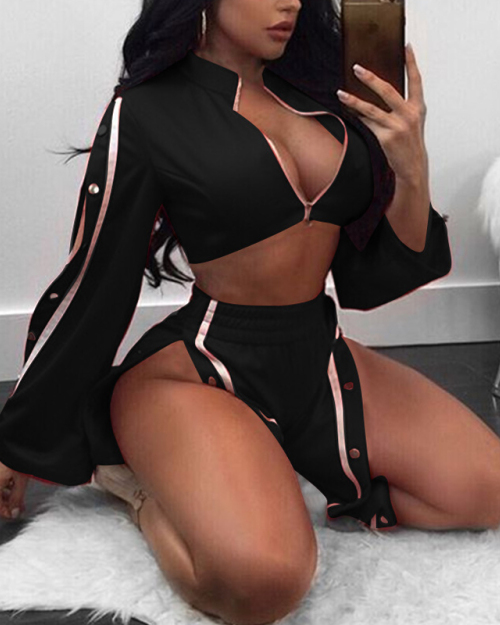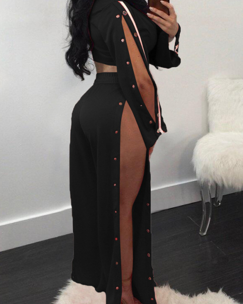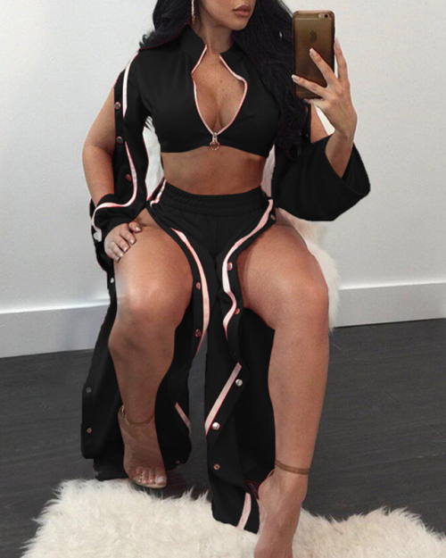 Sexy Zipper Design Black Polyester Two-piece Pants Set