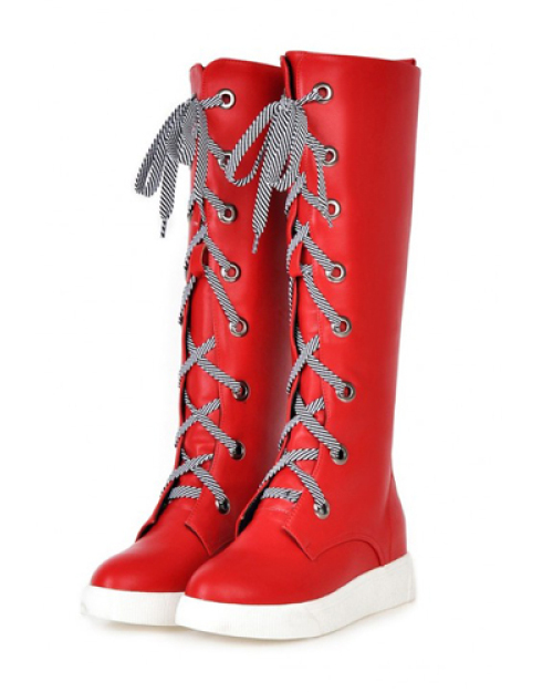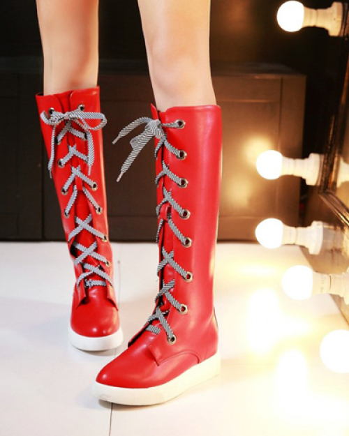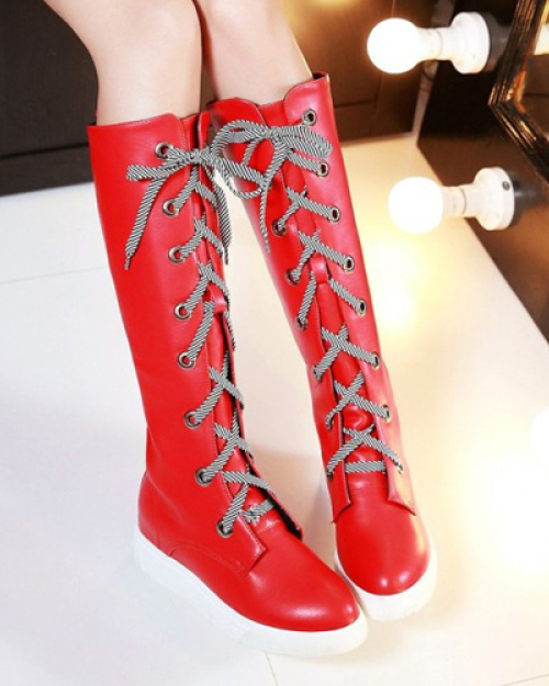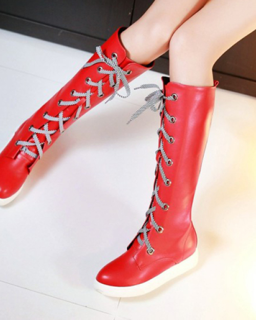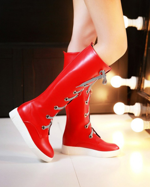 Fashion Spring Autumn Round Toe Lace Up Flat Low Heel Red PU Knee High Boots