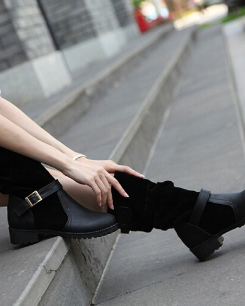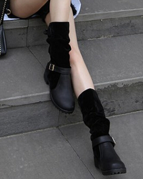 Spring Autumn Round Toe Flat Mid Heel Black PU Slip On Mid Calf Buckle Cavalier Boots
