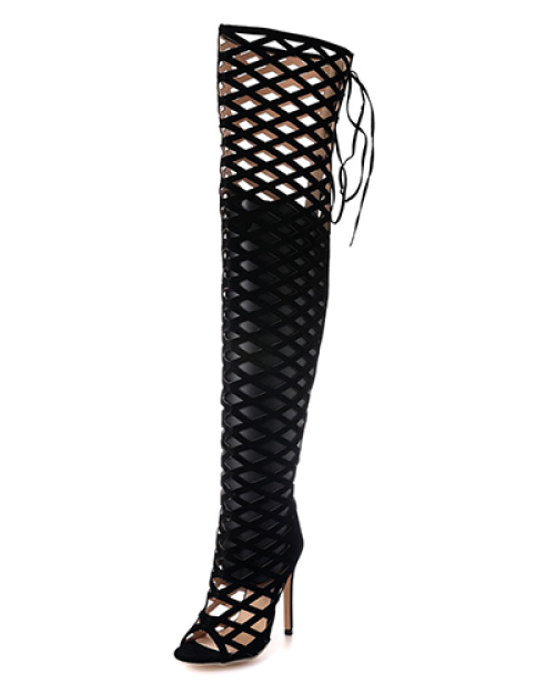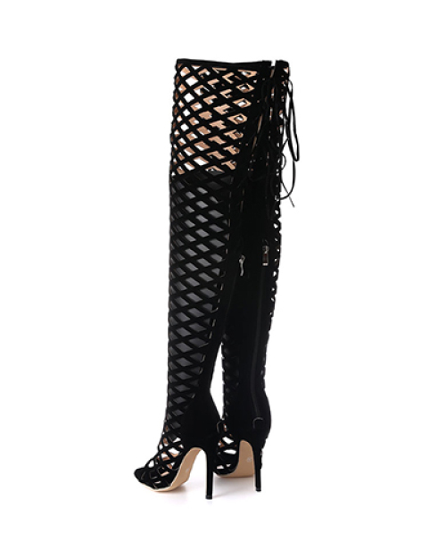 Stylish Pointed Peep Toe Hollow-out Stiletto Super High Heel Black Suede Over The Knee Boots