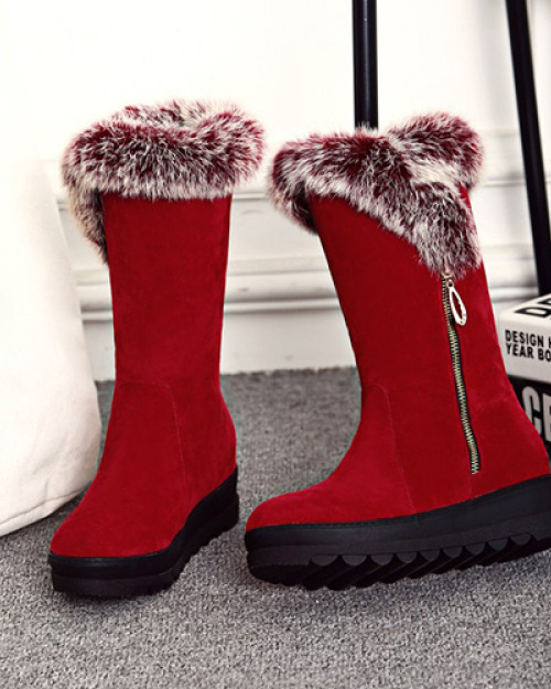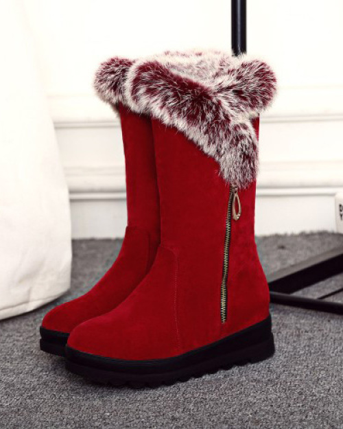 Stylish Round Toe Zipper Design Low Heel Red Suede Snow Boots