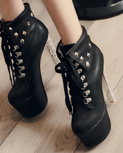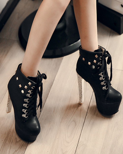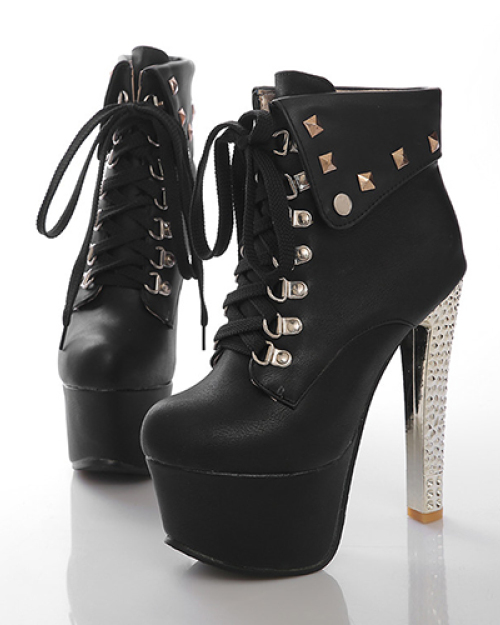 Trendy Round Toe Rivet Decorative Chunky Super High Heel Black PU Short Martin Boots