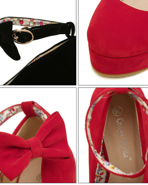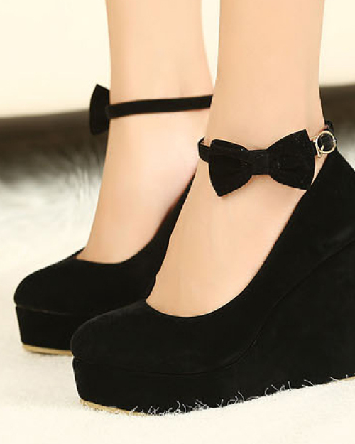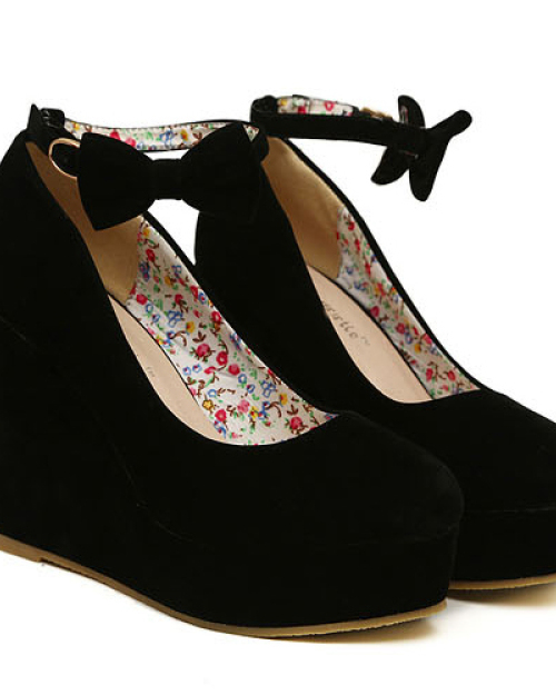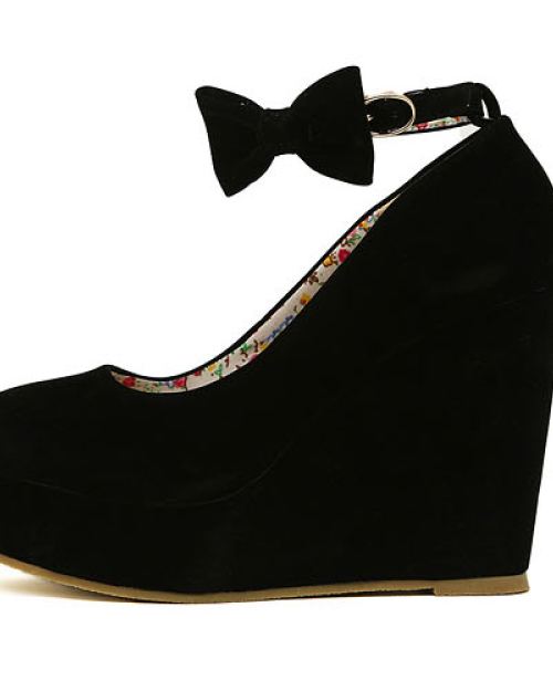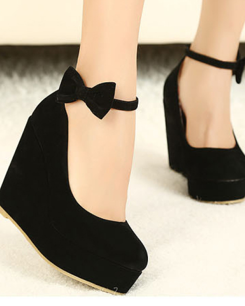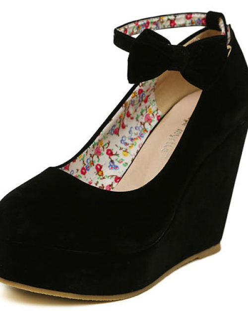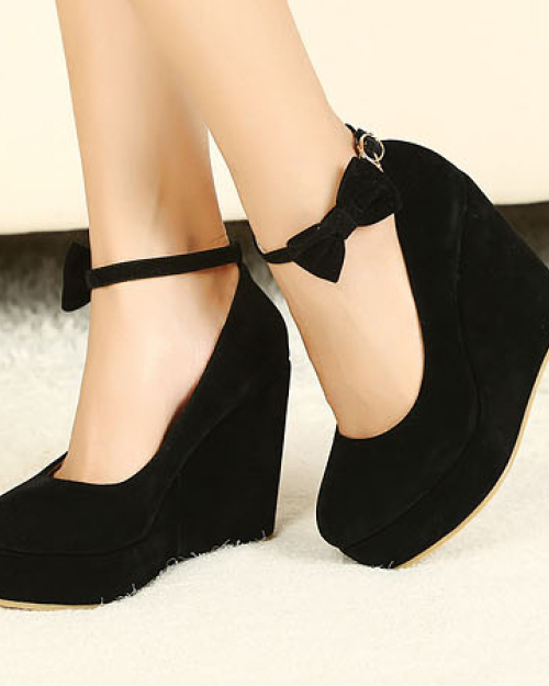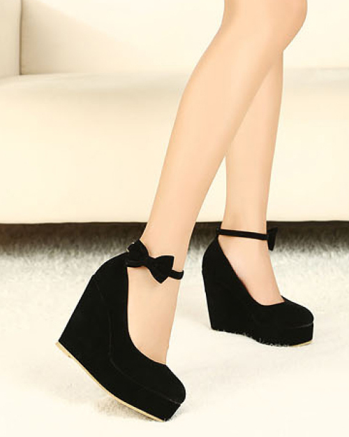 Fashion Round Closed Toe Super High Wedges Black Suede Ankle Strap Pumps