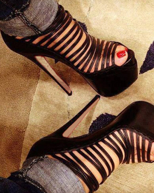 Stylish Round Peep Toe Hollow-out Stiletto Super High Heel PU Gladiator Pumps