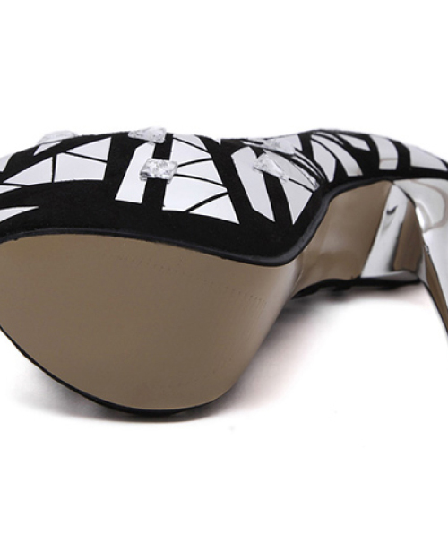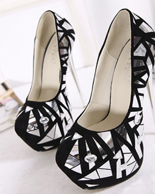 Stylish Round Toe Closed Toe Sequined Decorative Stiletto Super High Heel Black PU Basic Pumps