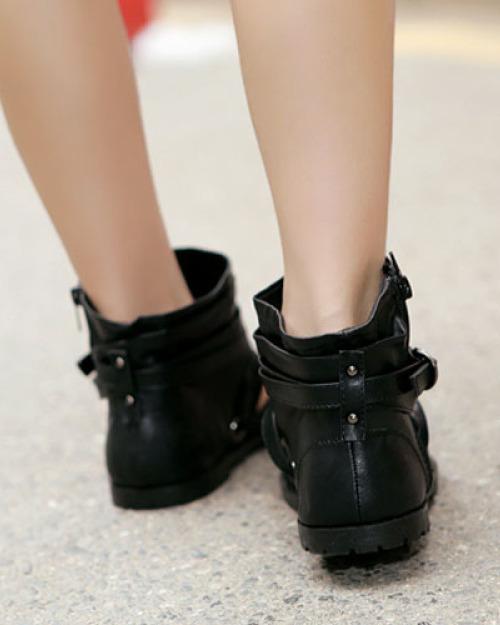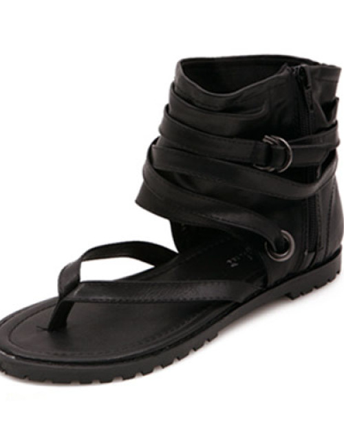 Casual Clip Toe Flat Low Heel Black PU Sandals