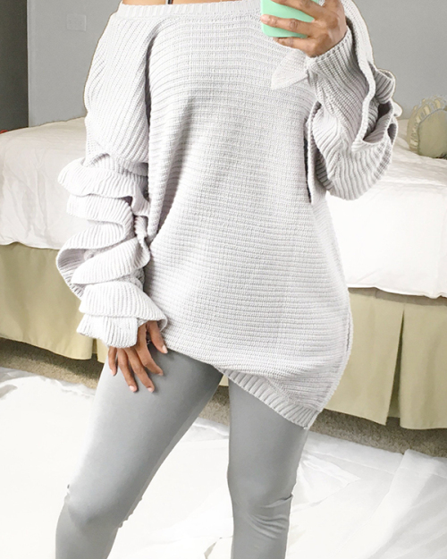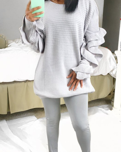 Stylish Long Sleeves Falbala Design Grey Cotton Sweaters