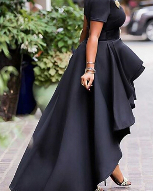 Stylish Mandarin Collar Asymmetrical Falbala Design Black Polyester Mid Calf Dress