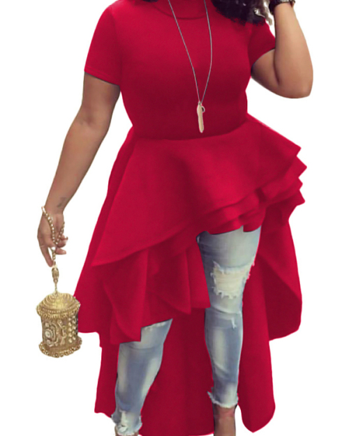 Stylish Mandarin Collar Asymmetrical Falbala Design Red Polyester Mid Calf Dress