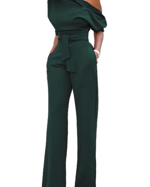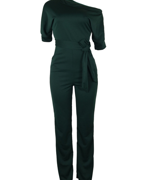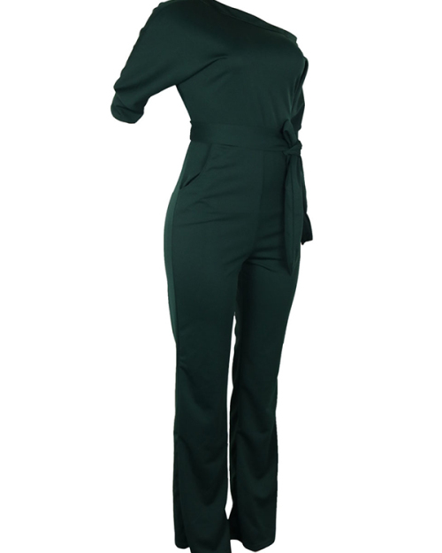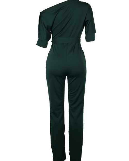 Stylish One-shoulder Army Green Polyester One-piece Jumpsuits(With Belt)