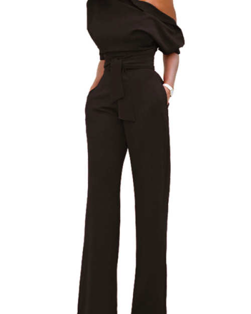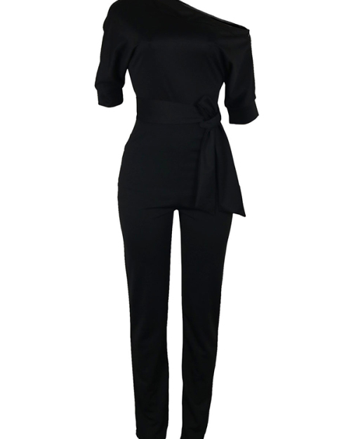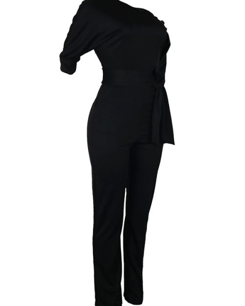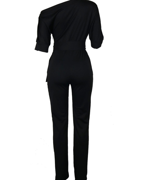 Stylish One-shoulder Black Polyester One-piece Jumpsuits(With Belt)
