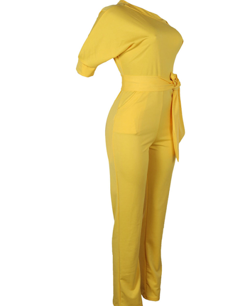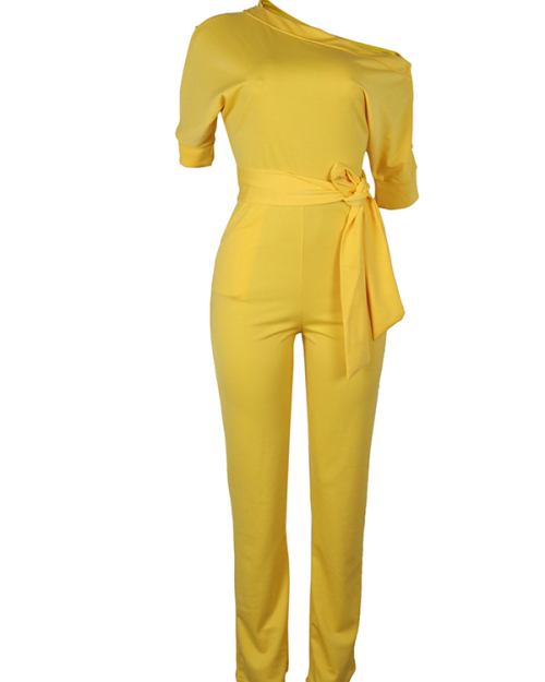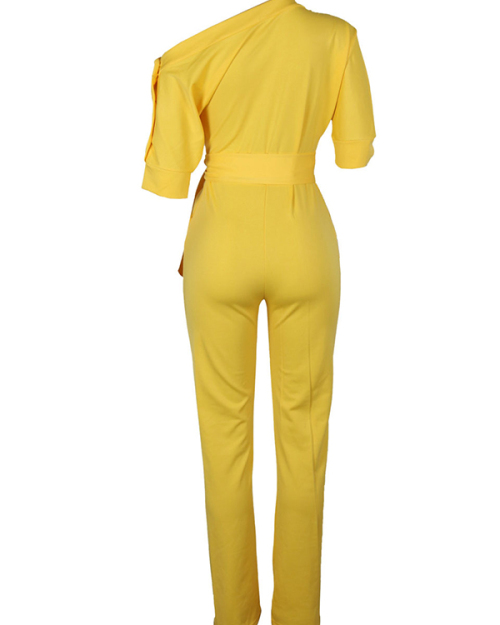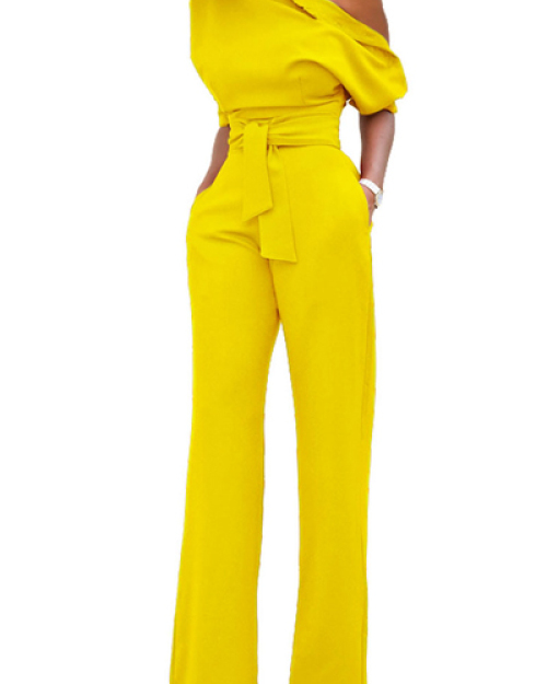 Stylish One-shoulder Yellow Polyester One-piece Jumpsuits(With Belt)
