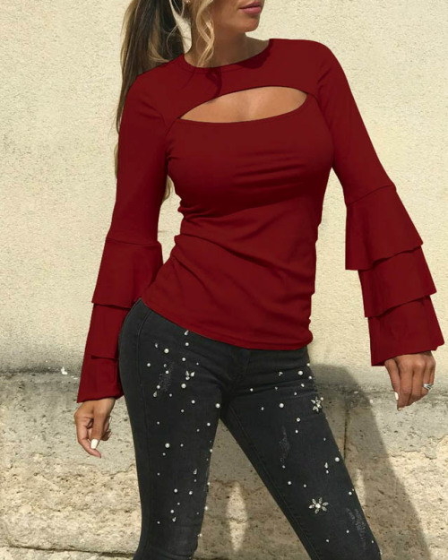 Stylish Round Neck Long Sleeves Hollow-out Wine Red Polyester Shirts