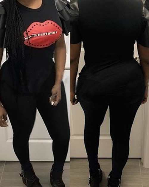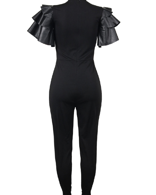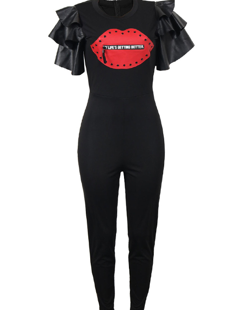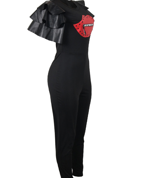 Stylish Round Neck Lotus Leaf Sleeves Lip Patchwork Black Polyester One-piece Jumpsuits