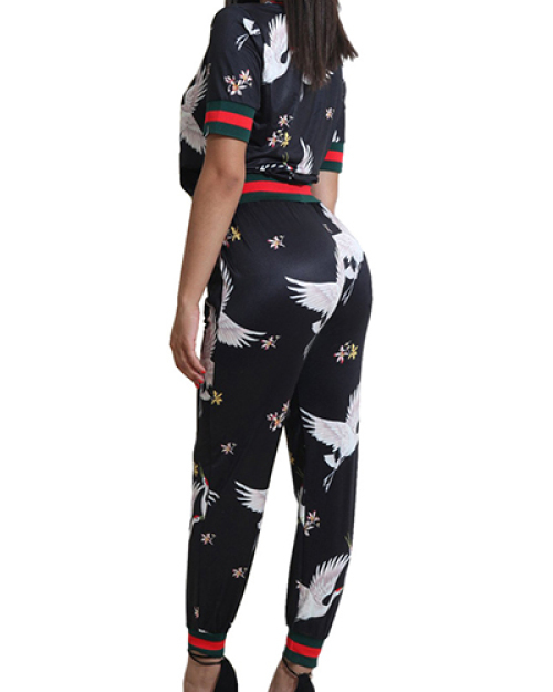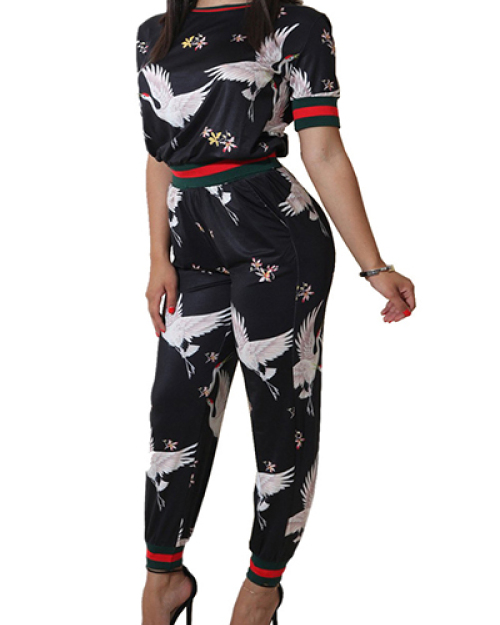 Stylish Round Neck Short Sleeves Printed Patchwork Black Knitting Two-piece Pants Set
