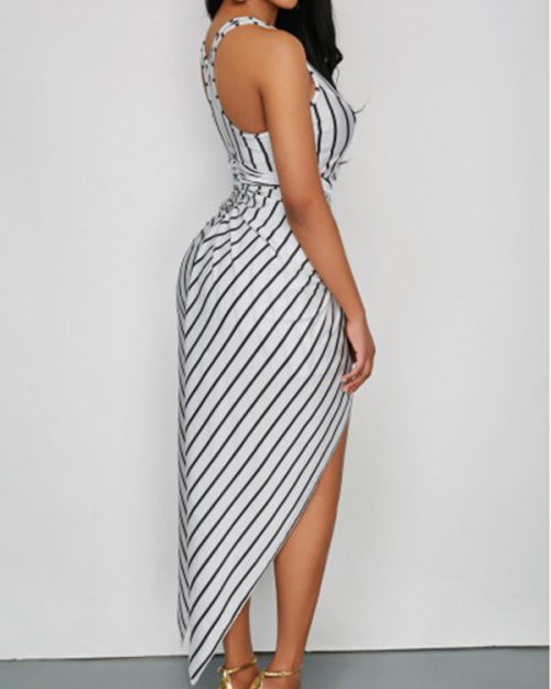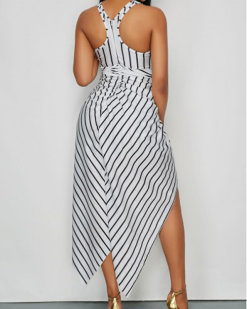 Stylish Round Neck Striped White Polyester Sheath Ankle Length Dress