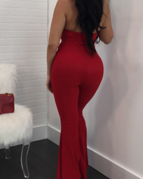 Stylish Spaghetti Strap Falbala Design Red Polyester One-piece Jumpsuits