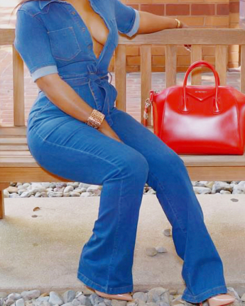 Stylish V Neck Lace-up Blue Denim One-piece Jumpsuits