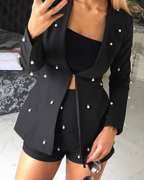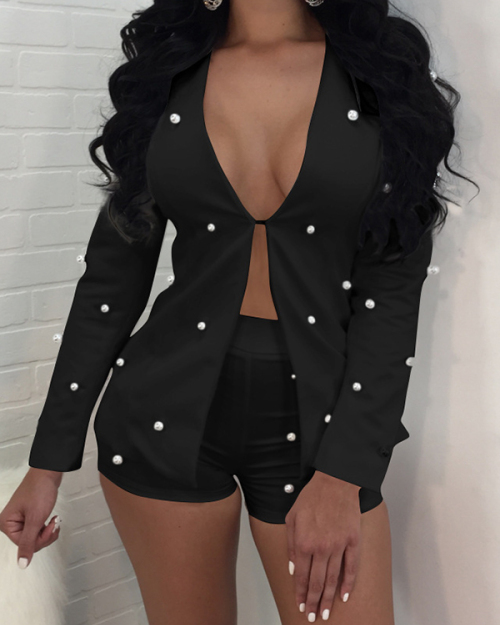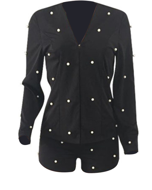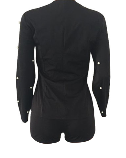 Stylish V Neck Pearl Decoration Black Knitting Two-piece Shorts Set