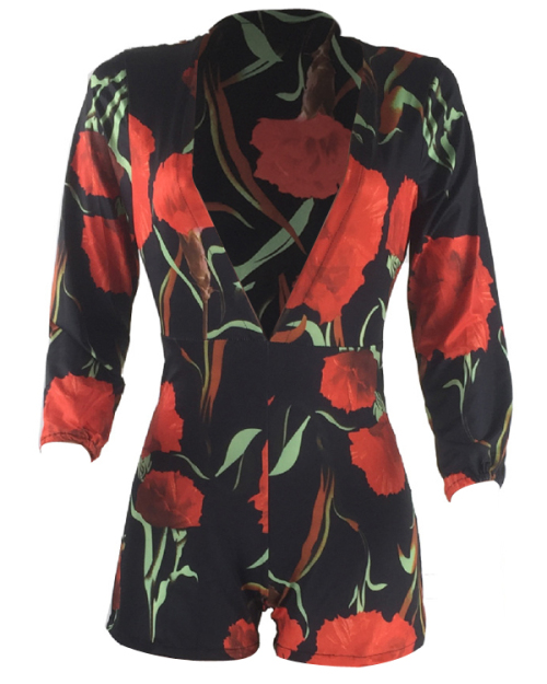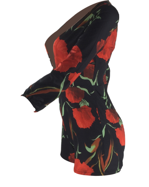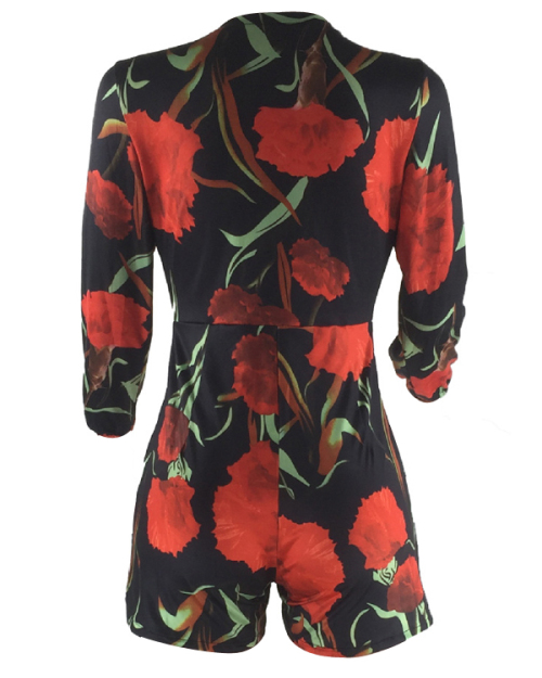 Stylish V Neck Printed Black Milk Fiber One-piece Skinny Jumpsuits