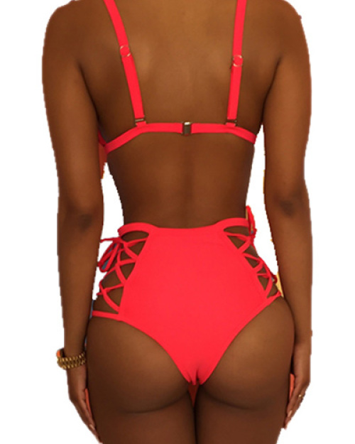 Euramerican V Neck Spaghetti Strap Lace-up Hollow-out Red Nylon Two-piece Swimwear