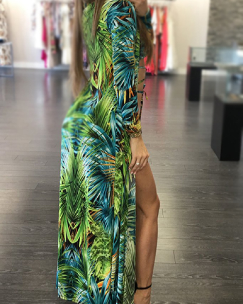 (Non Positioning Printing)Sexy Printed Lace-up Hollow-out Green Polyester Two-piece Swimwear(With Cover-up)