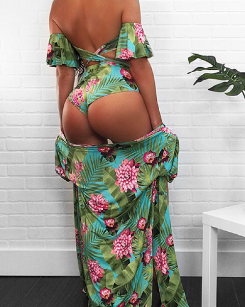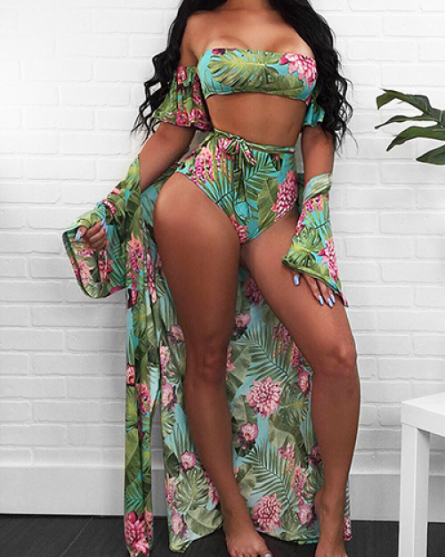 Sexy Printed Cyan Polyester Two-piece Swimwear(Contain Shawl)