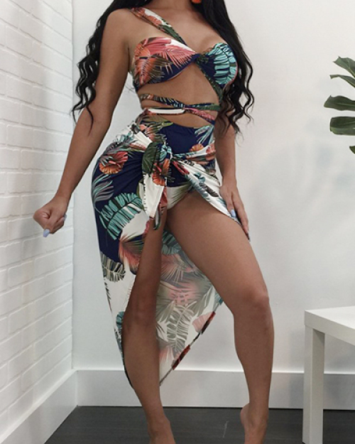 Sexy Printed Hollow-out White Milk Fiber Two-piece Swimwear(With Scarf)
