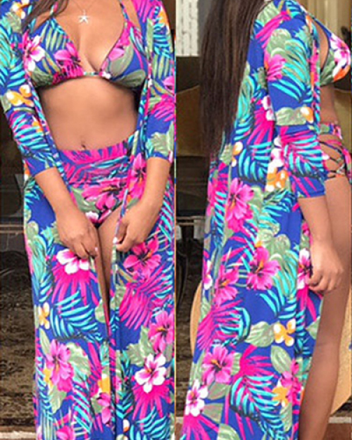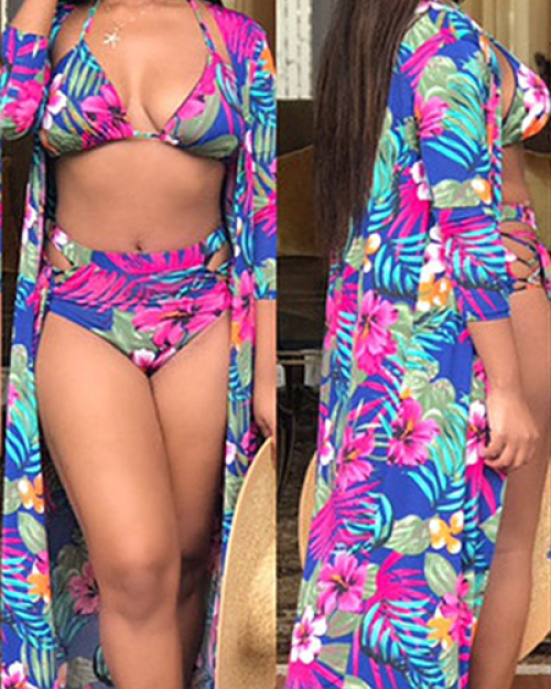 Trendy Printed Hollow-out Milk Fiber Two-piece Swimwear (With Shawl)