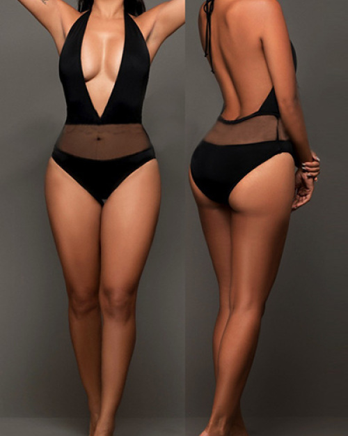 Sexy Deep V Neck Yarn Splicing Black Nylon One-piece Swimwear Sexy Deep V Neck Yarn Splicing Black Nylon One-piece Swimwear