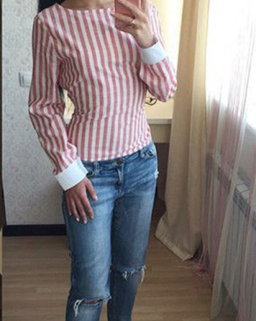 Euramerican Round Neck Long Sleeves V-shaped Backless Striped Pink Linen Shirts