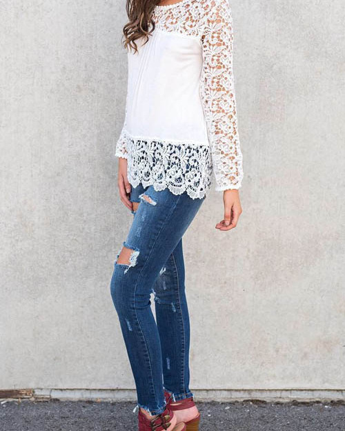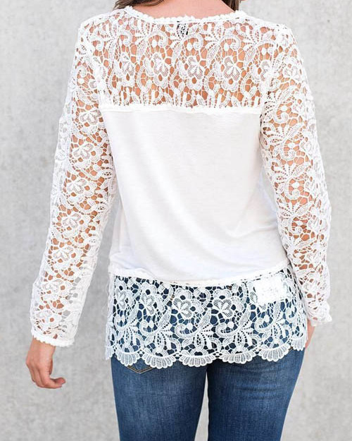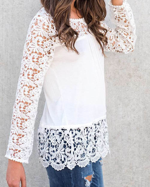 Stylish Round Neck Long Sleeves Lace Trim Patchwork White Polyester Shirts