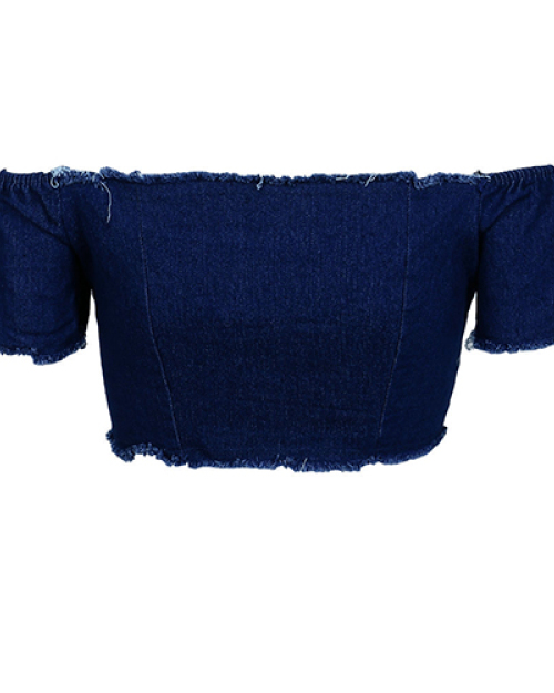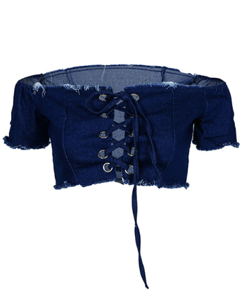 Sexy Dew Shoulder Lace-up Hollow-out Dark Blule Denim Shirts