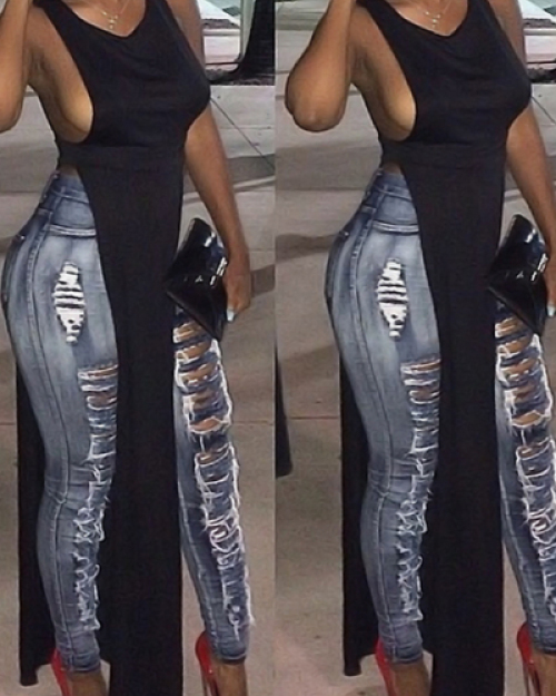 Sexy Round Neck Hollow-out Black Polyester Tank Top