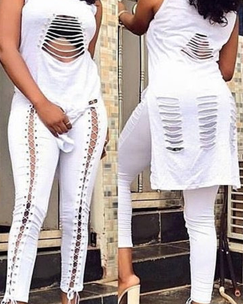 Sexy Round Neck Hollow-out White Milk Fiber Tank Top