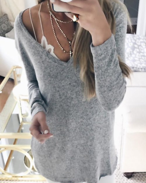 Euramerican V Neck Long Sleeves Grey Blending T-shirt(Without Accessories)