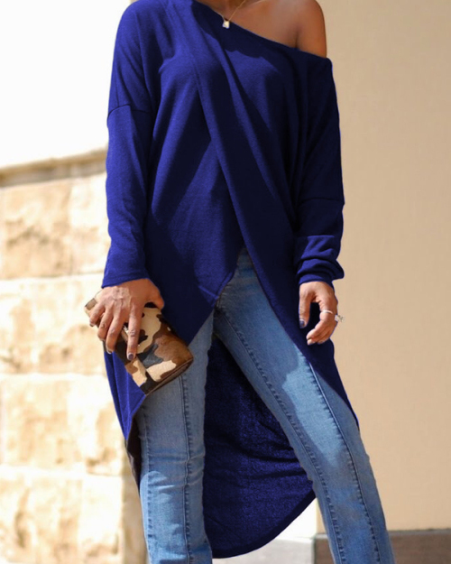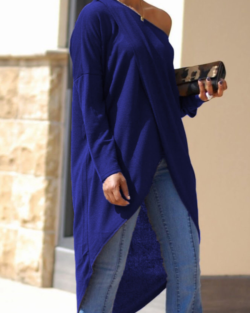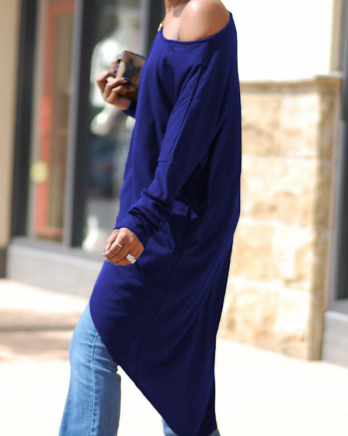 Leisure Dew Shoulder Long Sleeves Asymmetrical Navy Blue Cotton Shirts