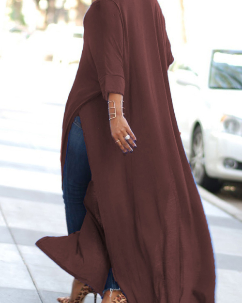 Leisure Round Neck High Split Coffee Cotton Shirts