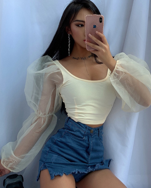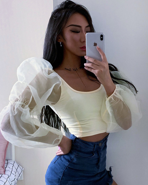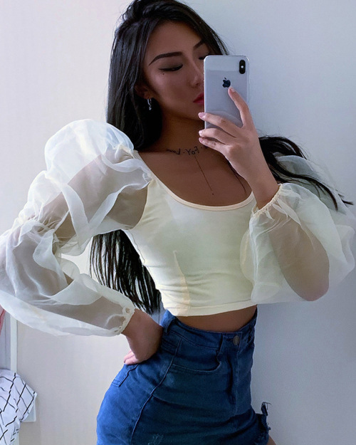 Long-sleeved vest top - selling new U collar crop revealing elastic sleeve top #95110