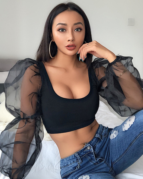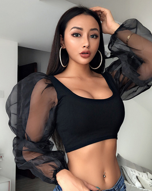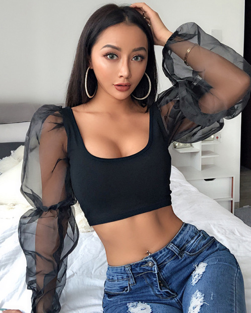 Long-sleeved vest top - selling new U collar crop revealing elastic sleeve top #95113