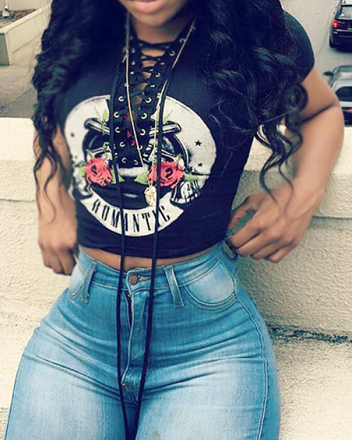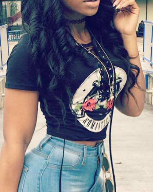 Sexy Deep V Neck Short Sleeves Printed Black Polyester T-shirt